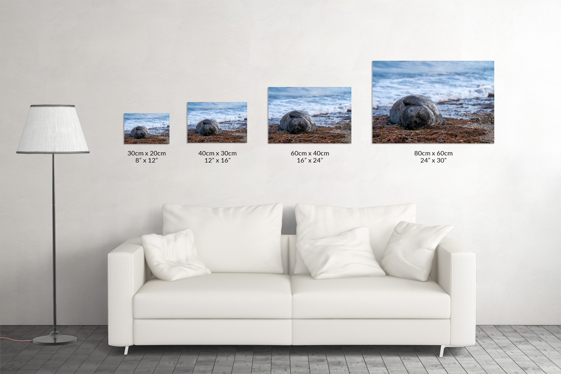 A photograph of a baby elephant seal taken at Playa Isla Escondida in Patagonia. Available for purchase as a canvas print in a range of sizes. More information can be found below.