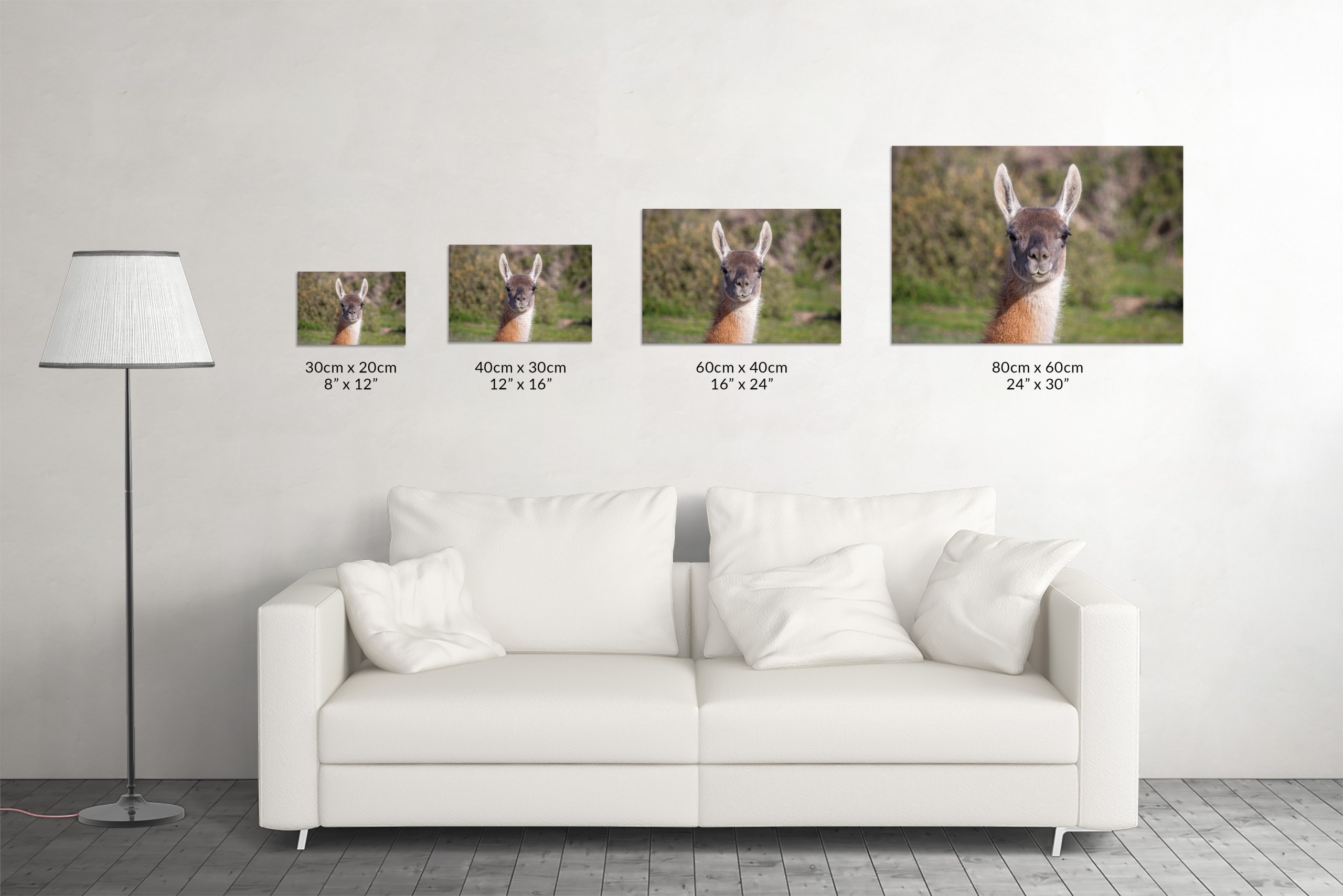 This photograph of a guanco catching sight of the camera was taken in Punta Tombo in Patagonia. Available for purchase as a canvas print in a range of sizes. More information can be found below.